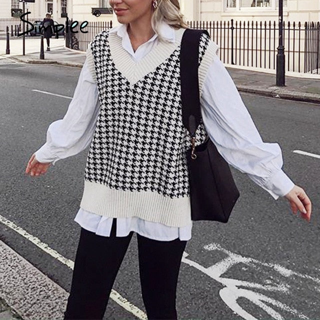 Simplee Women geometric khaki knitted sweater women casual Houndstooth lady pullover sweater female Autumn winter retro jumper